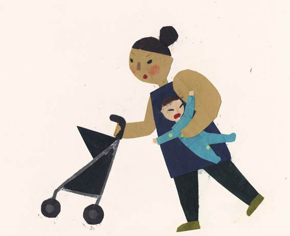 With screaming wrigglesome baby in one arm, push buggy homeward for as long as you can bear the noise, discomfort or the looks, to achieve that singular strong arm look.